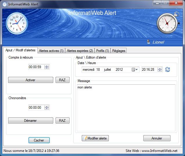 InformatiWeb Alert est un logiciel qui vous permettra de créer des alertes aux moments voulus et ainsi de ne plus oublier vos rendez-vous, ...