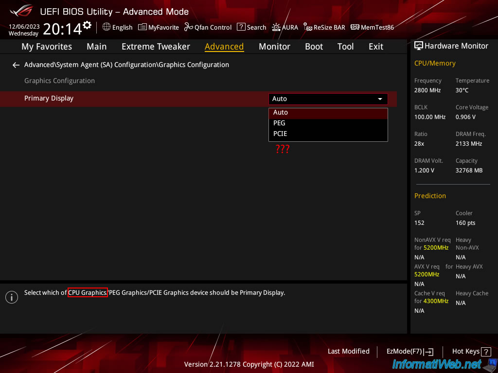Si vous affichez les valeurs disponibles pour ce paramètre "Primary Display" pour votre carte mère ASUS ROG MAXIMUS XIII HERO, vous remarquerez que vous pourrez choisir entre :
