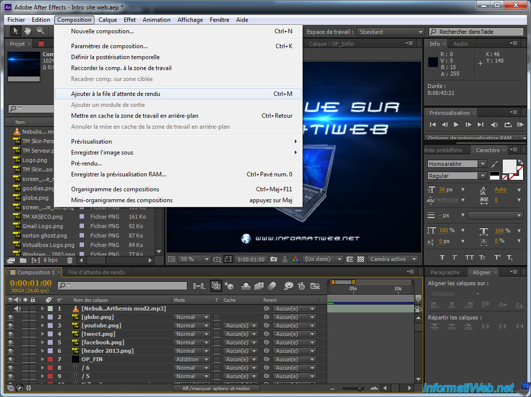 Pour effectuer un rendu de votre animation, allez dans le menu "Composition --> Ajouter à la file d'attente de rendu".