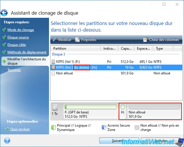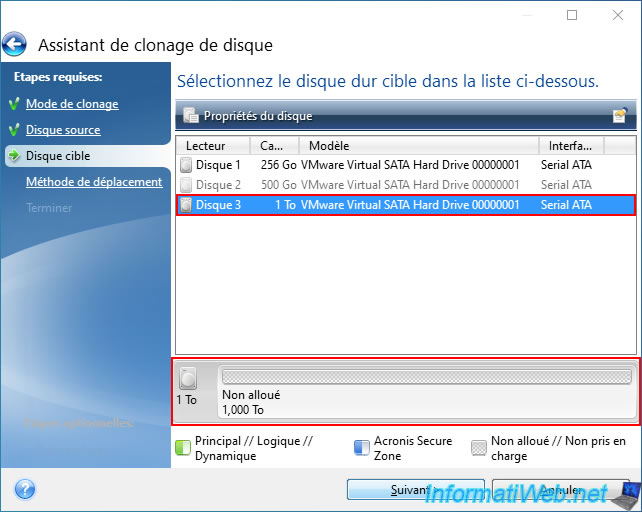 Sélectionnez votre disque cible (dans notre cas : le disque de 1 To qui est vide (espace non alloué) pour le moment), puis cliquez sur "Suivant".