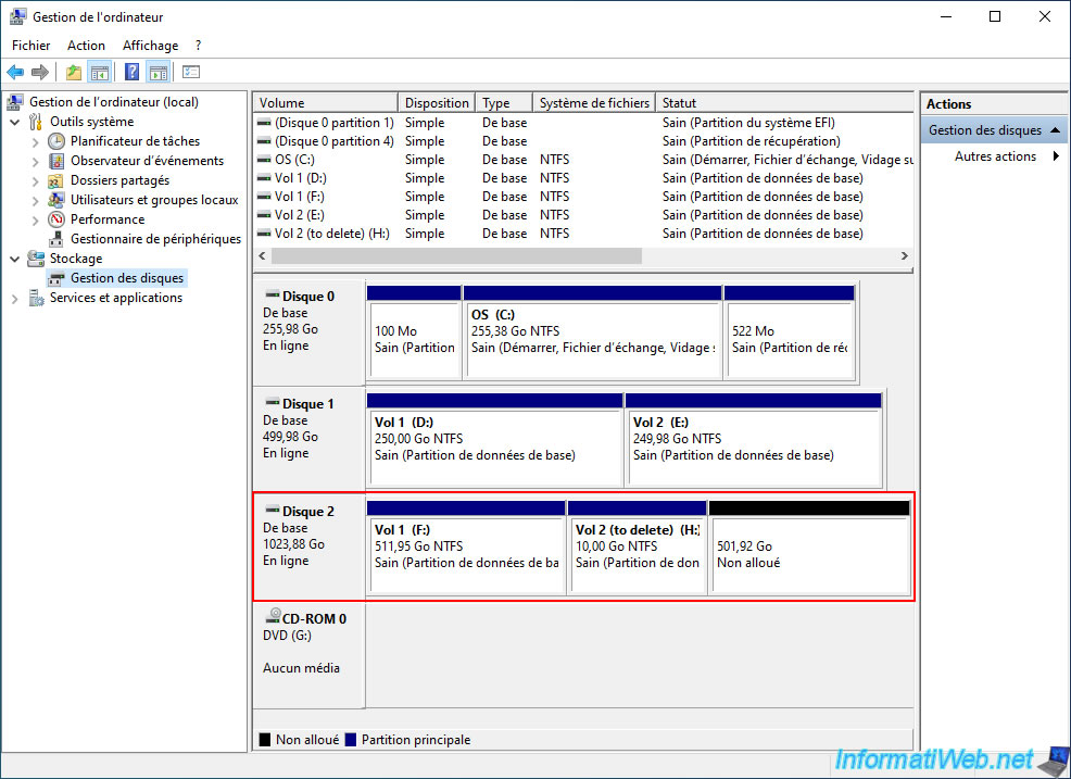 Ainsi, vous pourrez la supprimer très facilement depuis la gestion des disques et récupérer un espace non alloué unique à la fin de votre disque dur cible.
