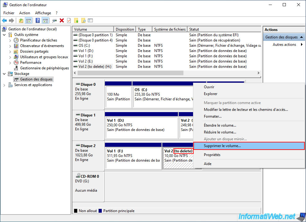 Faites un clic droit "Supprimer le volume" sur cette partition de 10 Go que vous aviez renommé en ajoutant "(to delete)" à la fin de son nom.