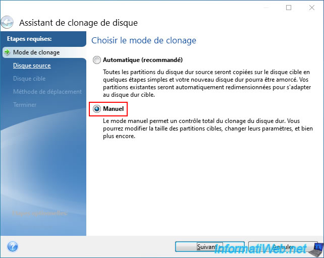 Dans la fenêtre "Assistant de clonage de disque" qui apparait, sélectionnez le mode de clonage "Manuel", puis cliquez sur "Suivant".