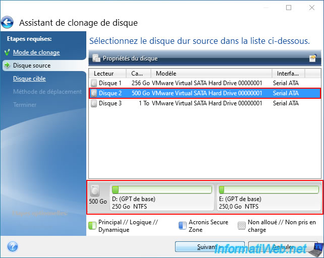 Sélectionnez votre disque source (dans notre cas : le disque de 500 Go avec les 2 partitions de 250 Go chacune), puis cliquez sur "Suivant".