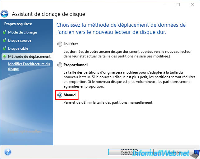 Sélectionnez la méthode de déplacement "Manuel" (qui vous permettra notamment de redimensionner et renommer les partitions copiées).