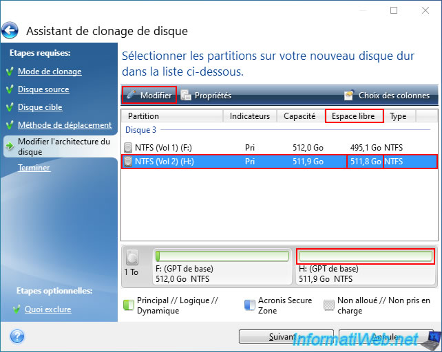 Sélectionnez cette partition que vous venez d'exclure de la copie des partitions de votre disque et cliquez sur "Modifier".