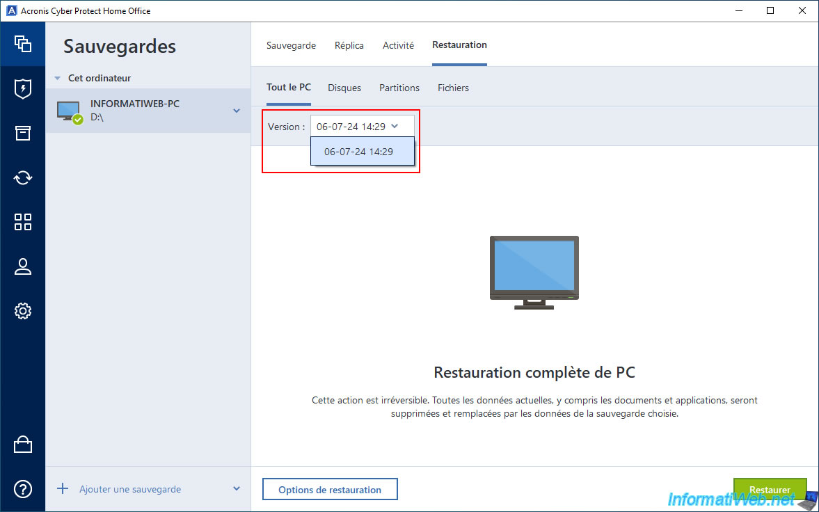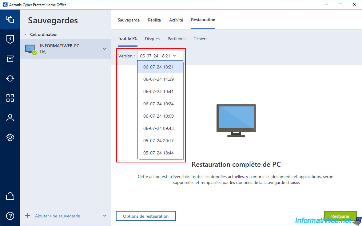 Comme vous pouvez le voir, dans notre cas, de nombreuses versions sont disponibles pour la sauvegarde de notre ordinateur.