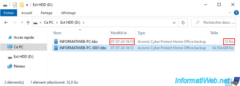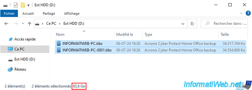 Actuellement, Acronis Cyber Protect Home Office (True Image) a créé 2 fichiers de sauvegardes ".tibx" qui pèsent environ 32 Go chacun dans notre cas.