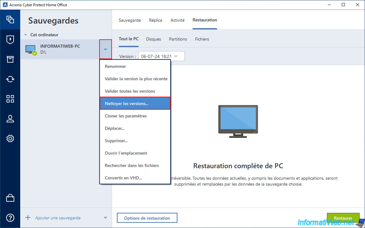 Pour cela, cliquez sur la flèche à droite de votre sauvegarde, puis sur "Nettoyer les versions".