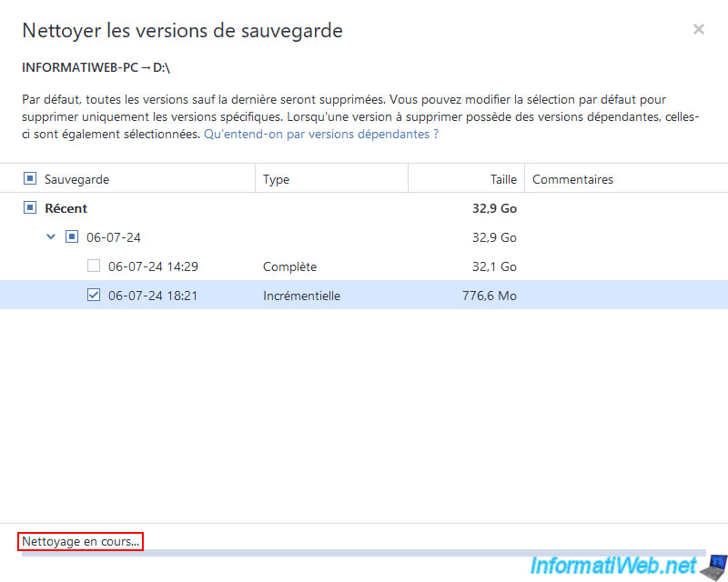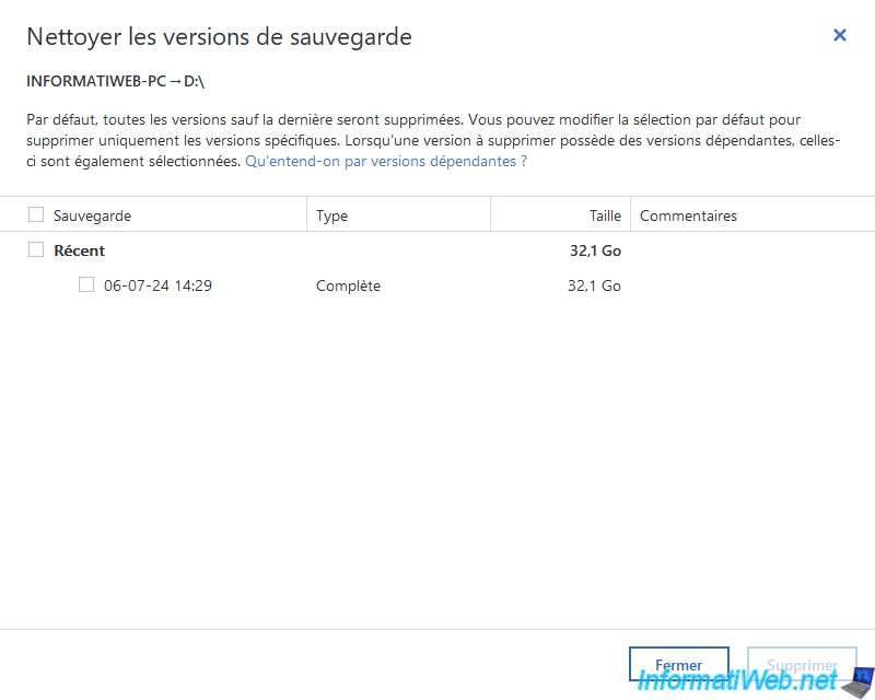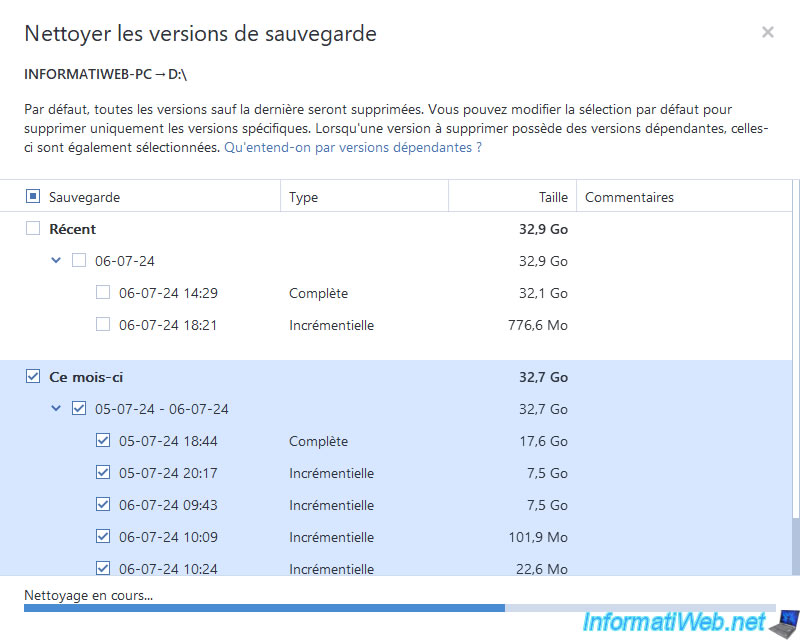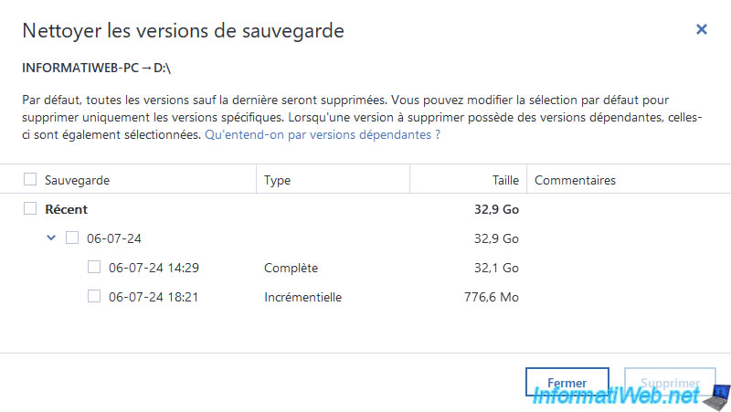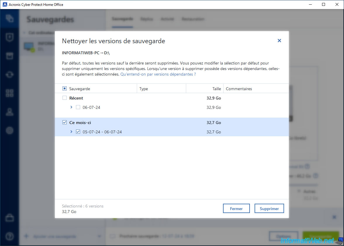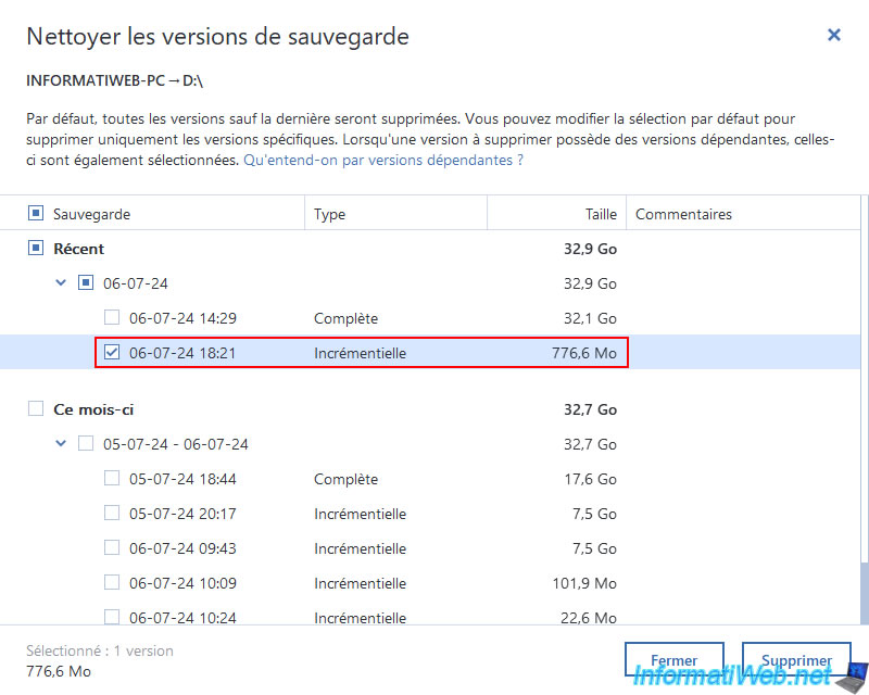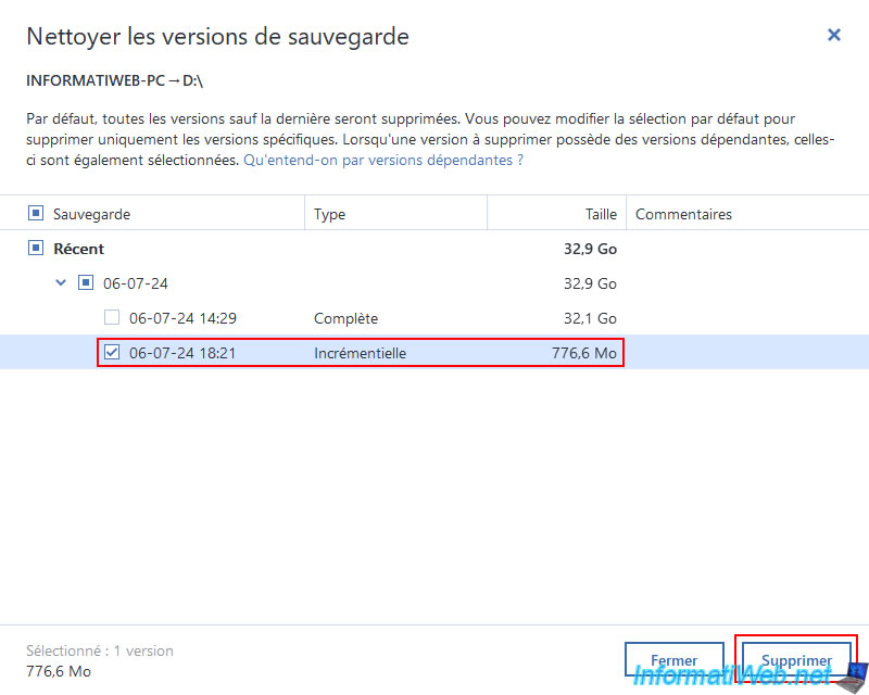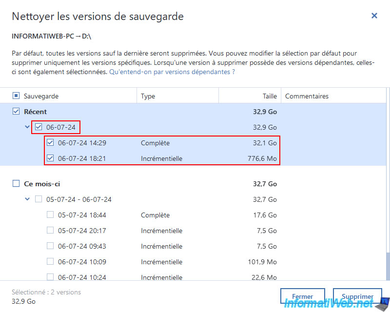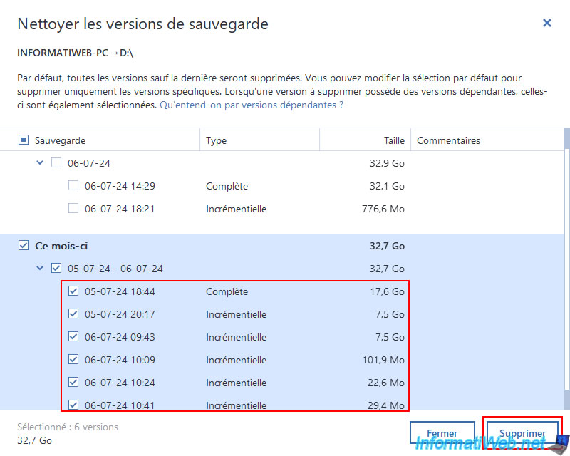 Une fois les versions de sauvegardes souhaitées sélectionnées, cliquez sur "Supprimer".