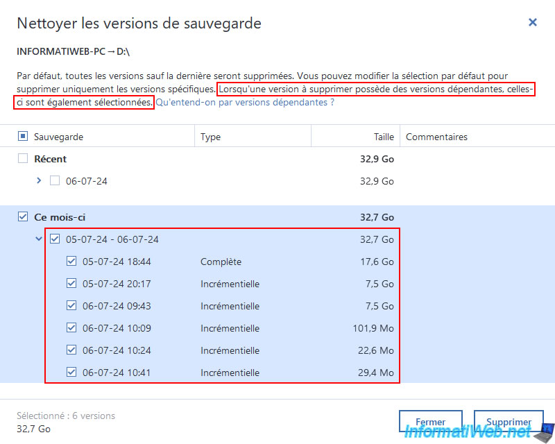 Par contre, si nous tentons de supprimer la sauvegarde complète récente du "06-07-24 14:29", Acronis Cyber Protect Home Office (True Image) sélectionnera également la sauvegarde incrémentielle située juste après celle-ci étant donné que cette sauvegarde incrémentielle dépend de la sauvegarde complète qu'on tente de supprimer.