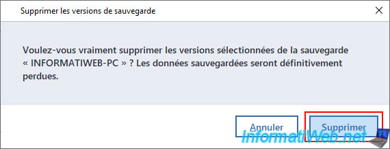 Dans la fenêtre "Supprimer les versions de sauvegarde" qui s'affiche, cliquez sur "Supprimer" pour confirmer la suppression de ces versions de sauvegardes.