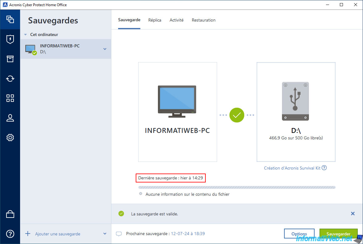Si nous retournons dans l'onglet "Sauvegarde", nous pouvons voir que la date de la dernière sauvegarde correspond à la date de la sauvegarde la plus récente que nous avons laissée dans notre cas.