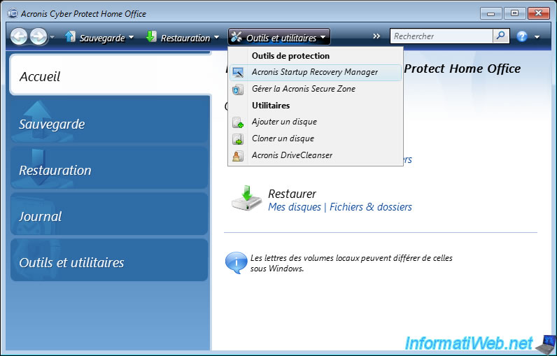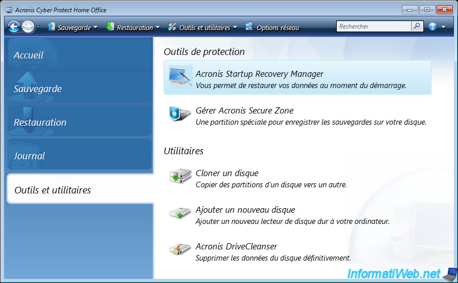 Ou alors, allez dans la section "Outils et utilitaires", puis cliquez sur l'outil de protection "Acronis Startup Recovery Manager".