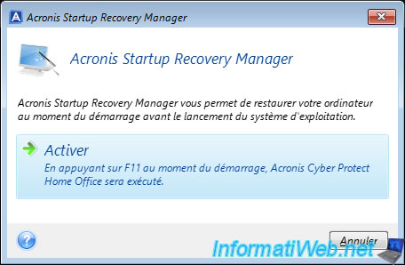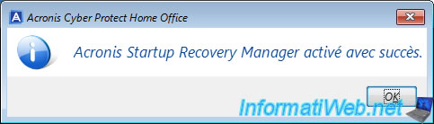 Une fois l'option activée, le message "Acronis Startup Recovery Manager activé avec succès" apparaitra.