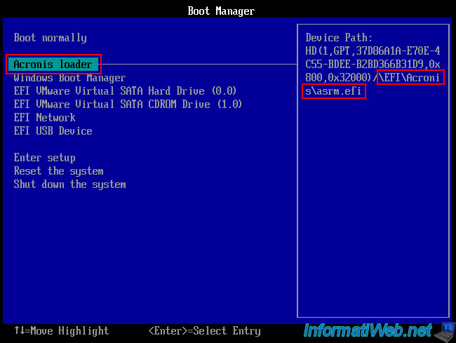Comme vous pouvez le voir, cela permet de démarrer sur un fichier "EFI\Acronis\asrm.efi" présent sur votre disque dur.