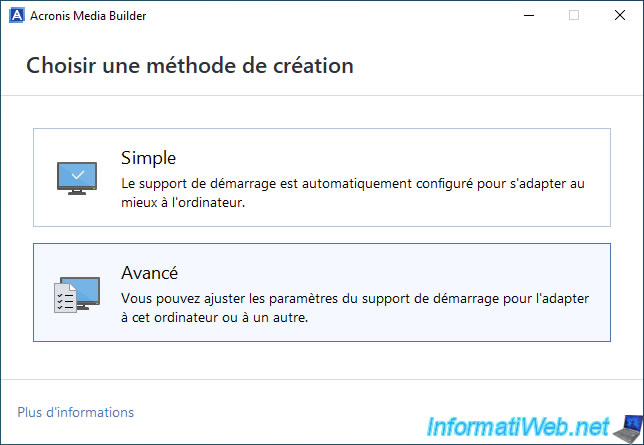 Ensuite, dans la fenêtre "Acronis Media Builder" qui s'affiche, cliquez sur "Avancé".