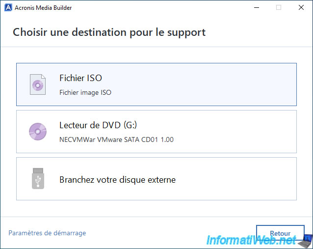 Dans notre cas, nous avons choisi "Fichier ISO" comme destination pour le support.