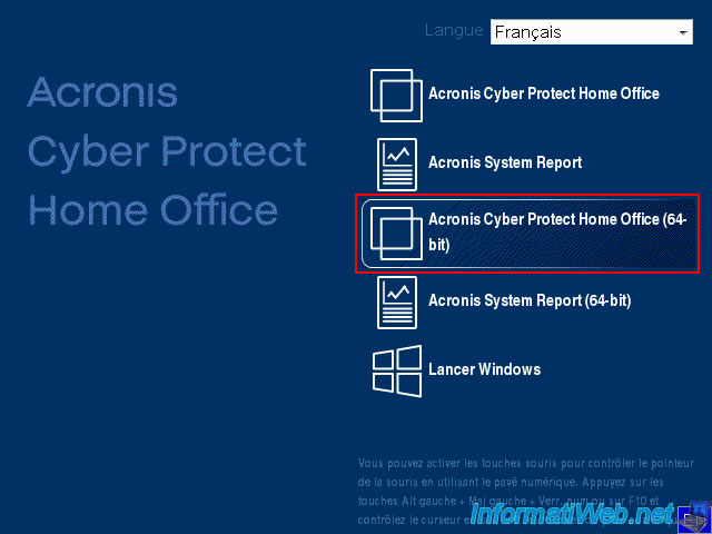 Dans ce cas, cliquez sur "Acronis Cyber Protect Home Office" (si vous avez un PC très vieux avec un processeur 32 bits) ou sur "Acronis Cyber Protect Home Office (64-bit) sur un PC récent (qui possède donc un processeur 64 bits, ce qui est devenu très courant).