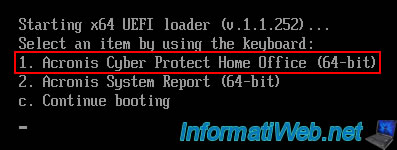 Tapez 1 pour lancer l'outil "Acronis Cyber Protect Home Office (64-bit)".