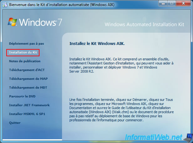 Dans la fenêtre "Bienvenue dans le Kit d'installation automatisée (Windows AIK)" qui s'affiche, cliquez sur "Installation du Kit".