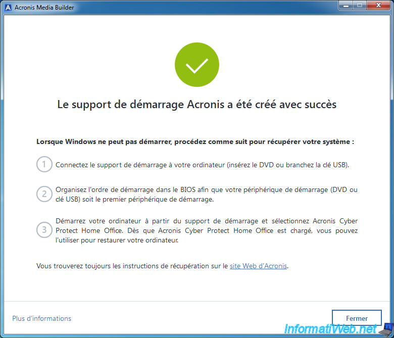 Une fois votre support de secours Acronis créé, cliquez sur Fermer.
