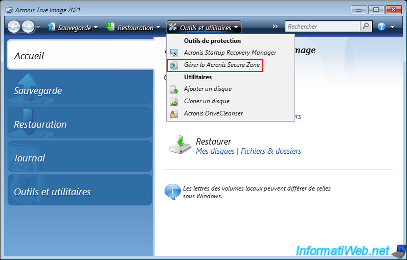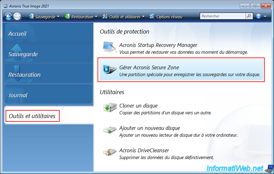 Ou alors, allez dans la section "Outils et utilitaires" de ce programme Acronis et cliquez sur l'outil de protection "Gérer Acronis Secure Zone".