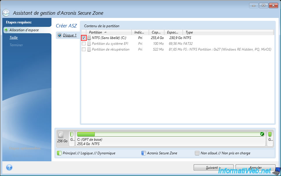 Puis, cochez la case de la partition dont il faudra réduire la taille pour créer une nouvelle partition (Acronis Secure Zone) à la fin du disque souhaité grâce à l'espace disque libéré.