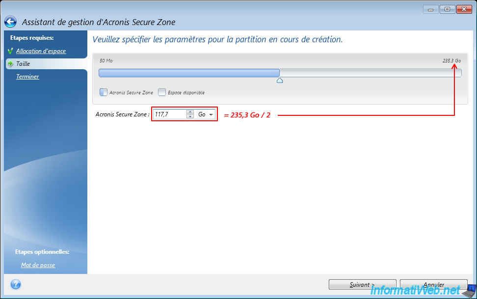 Par défaut, l'assistant utilisera la moitié de la taille de la partition sélectionnée pour la taille de la future partition "Acronis Secure Zone".