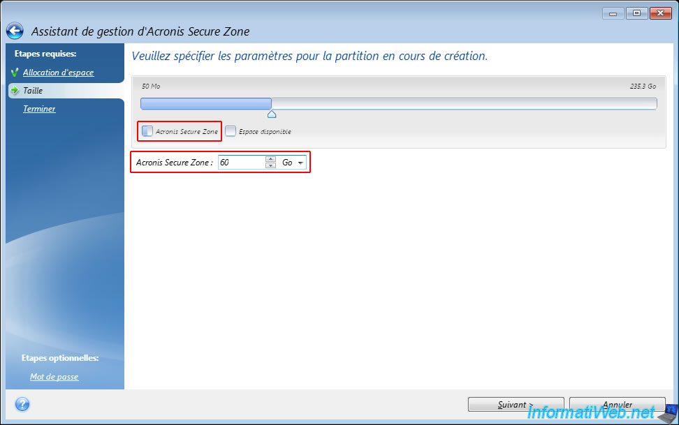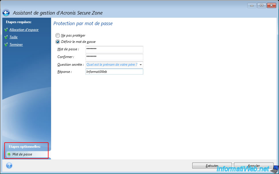 Si vous souhaitez protéger l'accès à cette partition spéciale "Acronis Secure Zone", cliquez sur l'étape optionnelle "Mot de passe" (située en bas à gauche) de cet assistant.