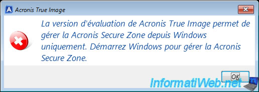 La version d'évaluation de Acronis Cyber Protect Home Office (True Image) permet de gérer la Acronis Secure Zone depuis Windows uniquement. Démarrez Windows pour gérer la Acronis Secure Zone.