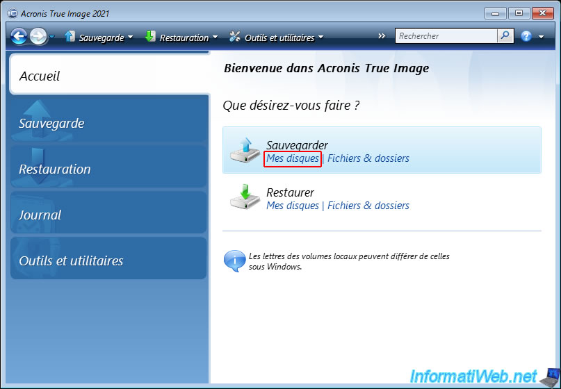 Pour cela, cliquez sur le lien "Mes disques" de l'option "Sauvegarder".