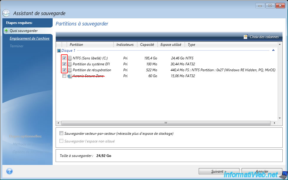 Attention : il est important d'ignorer la partition "Acronis Secure Zone" pour ne pas perdre vos sauvegardes en restaurant plus tard les partitions à sauvegarder.