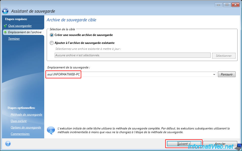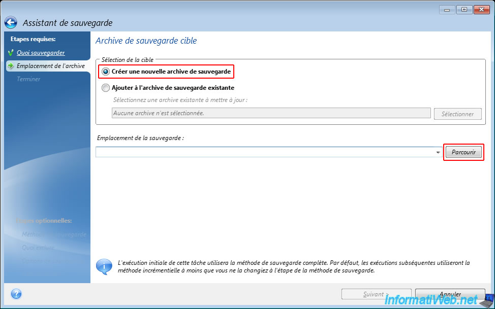 Sélectionnez "Créer une nouvelle archive de sauvegarde" et cliquez sur "Parcourir".