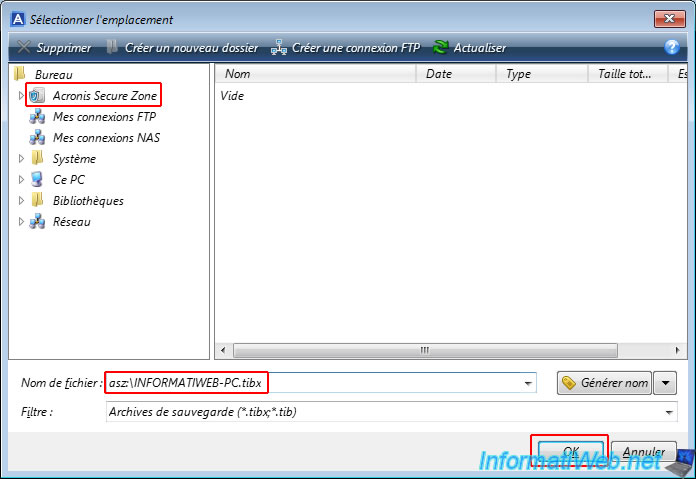 Allez dans l'emplacement "Acronis Secure Zone" situé en haut à gauche de la fenêtre "Sélectionner l'emplacement", puis indiquer un nom de fichier avec l'extension ".tibx" pour la sauvegarde qui sera créée sur cette zone sécurisée Acronis.