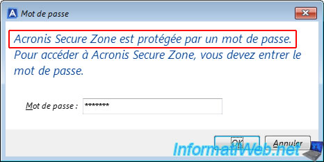 Si vous avez protégé votre zone sécurisée Acronis (Acronis Secure Zone) avec un mot de passe (lors de sa création), un popup s'affichera et vous le demandera.