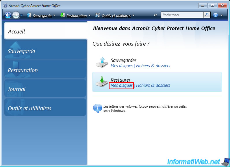 Pour restaurer votre ordinateur depuis une sauvegarde présente sur votre serveur FTP, cliquez sur le lien "Mes disques" de l'option "Restaurer".