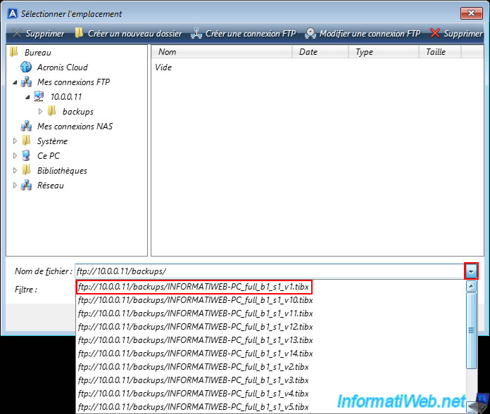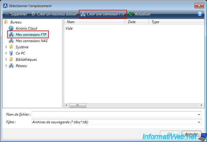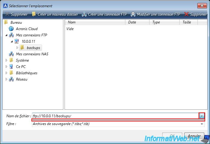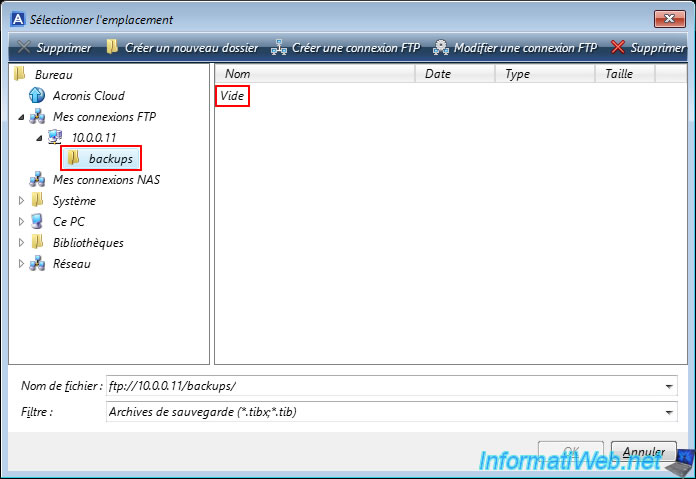 Rentrez dans le dossier souhaité de votre serveur FTP apparu dans la colonne de gauche et vous remarquerez qu'Acronis considère ce dossier comme vide.
