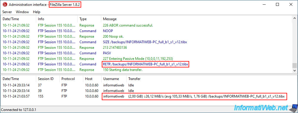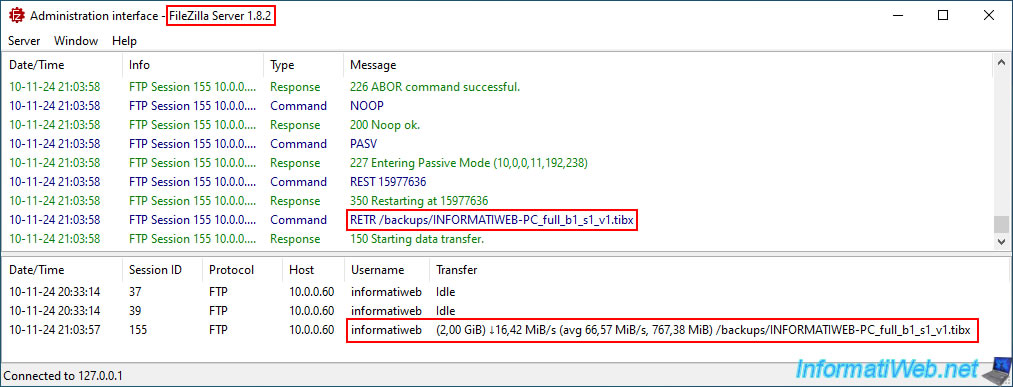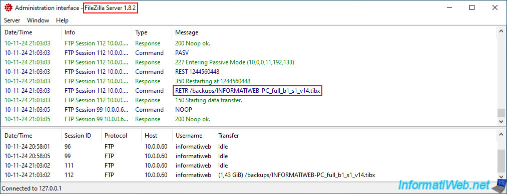 Sur votre serveur FTP, vous pouvez voir que votre ordinateur est en train de télécharger le 1er fichier de votre sauvegarde (_v1.tibx) stockée sur votre serveur FTP.