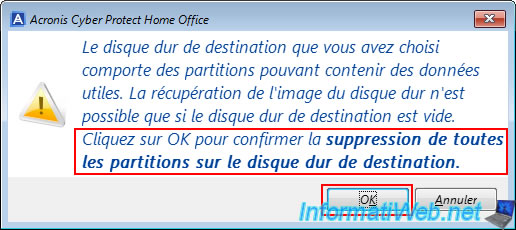 Ignorez l'avertissement qui s'affiche qui vous indique que les partitions de votre disque physique seront supprimées pour pouvoir restaurer les données de votre sauvegarde sur le disque physique sélectionné.
