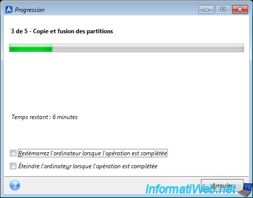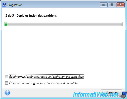Sur votre ordinateur, vous verrez juste la barre de progression avancer et le message "Copie et fusion des partitions".