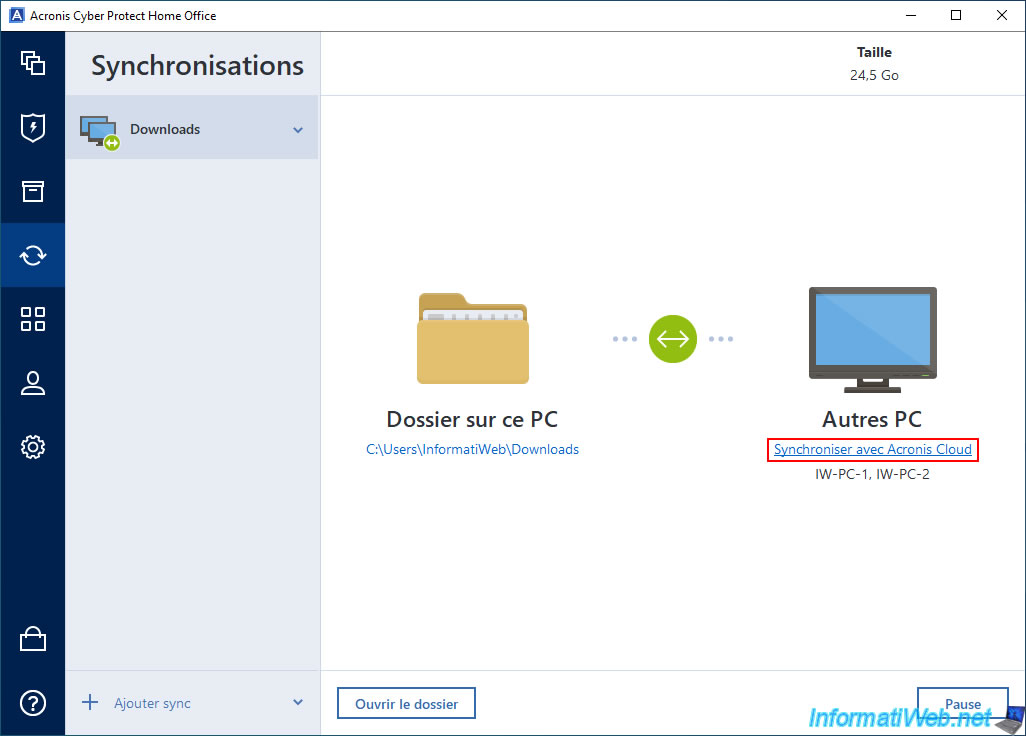 Ainsi, Acronis Cyber Protect Home Office (True Image) continuera de synchroniser le dossier souhaité entre vos ordinateurs, mais uniquement en utilisant Acronis Cloud comme intermédiaire.