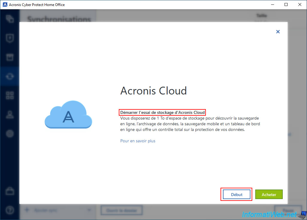 Pour cela, cliquez sur "Début" pour bénéficier de l'essai gratuit à Acronis Cloud ou sur "Acheter" pour acheter un abonnement pour ce service.