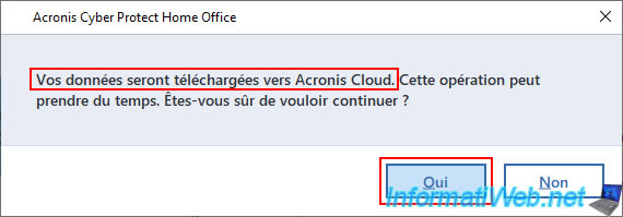 Confirmez cet envoi de vos données chez Acronis Cloud en cliquant sur "Oui".