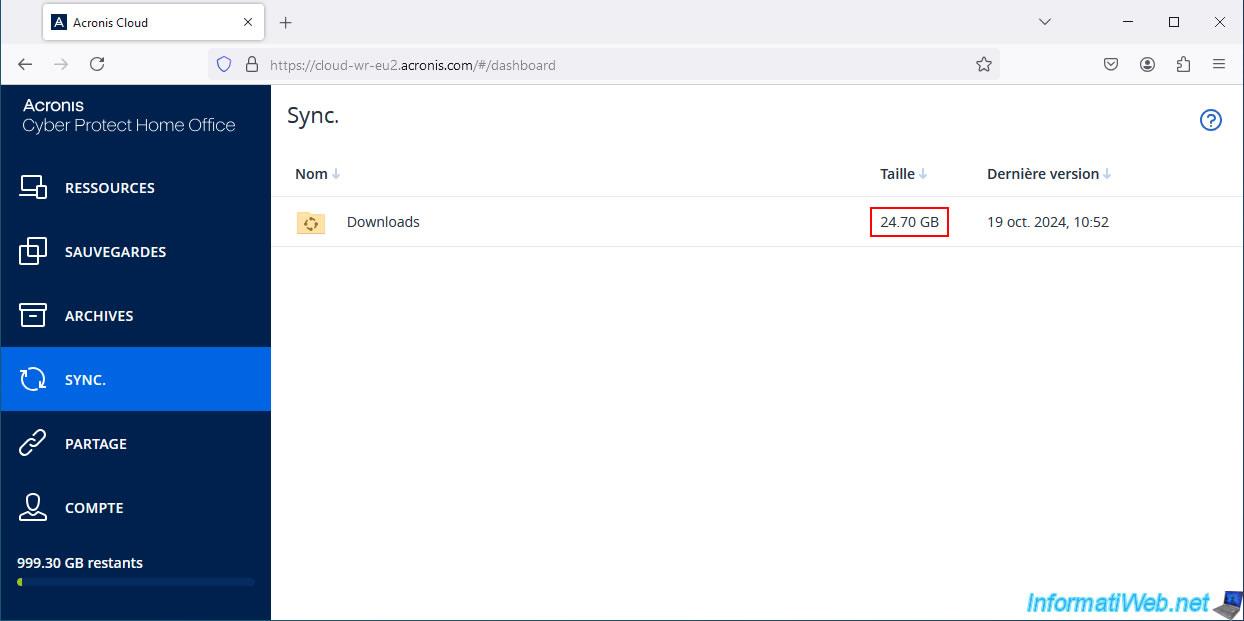 Une fois le fichier souhaité ajouté sur votre ordinateur, allez dans la section "Sync" d'Acronis Cloud et vous remarquerez que la taille du dossier en cours de synchronisation augmentera.