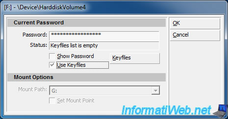Note : Si vous avez ajouté un ou plusieurs fichiers de clé lors du cryptage de votre clé USB, vous devez cocher la case "Use Keyfiles" et cliquer sur le bouton "Keyfiles".