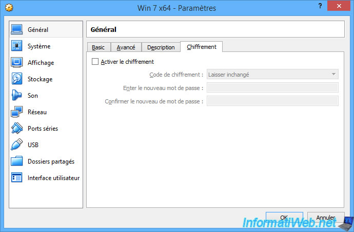 Dans l'onglet "Chiffrement" (ou "Chiffrement de disque" depuis VirtualBox 6.1), vous pourrez activer le chiffrement de la machine virtuelle et utiliser un mot de passe pour pouvoir la réutiliser.