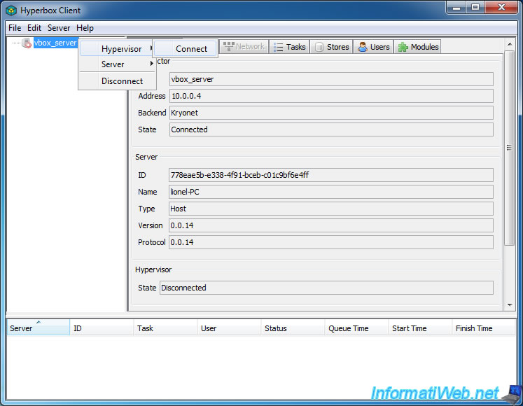Dans Hyperbox Client, faites un clic droit sur votre serveur et cliquez sur : Hypervisor -> Connect.