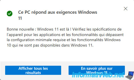 Si votre matériel est supporté officiellement par Microsoft, le message "Ce PC répond aux exigences Windows 11" apparaitra.