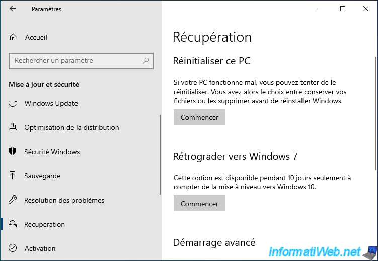Ensuite, dans l'onglet "Récupération", vous trouverez une section "Rétrograder vers Windows 7" avec un bouton "Commencer".